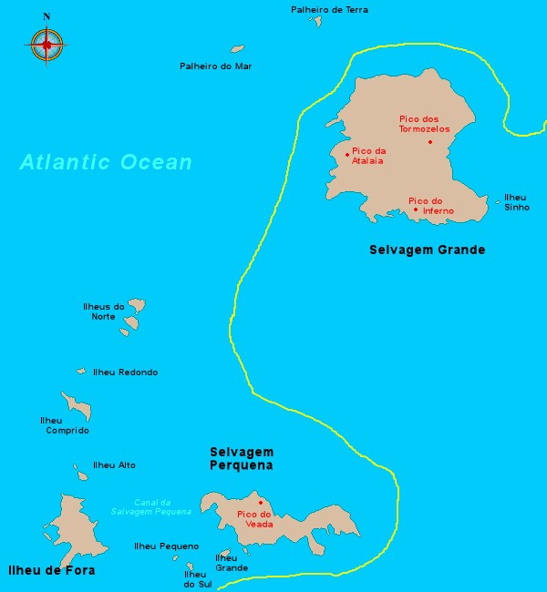The northeast group comprises Selvagem Grande and two smaller islets, Palheiro de Terra and Palheiro do Mar.